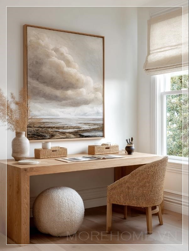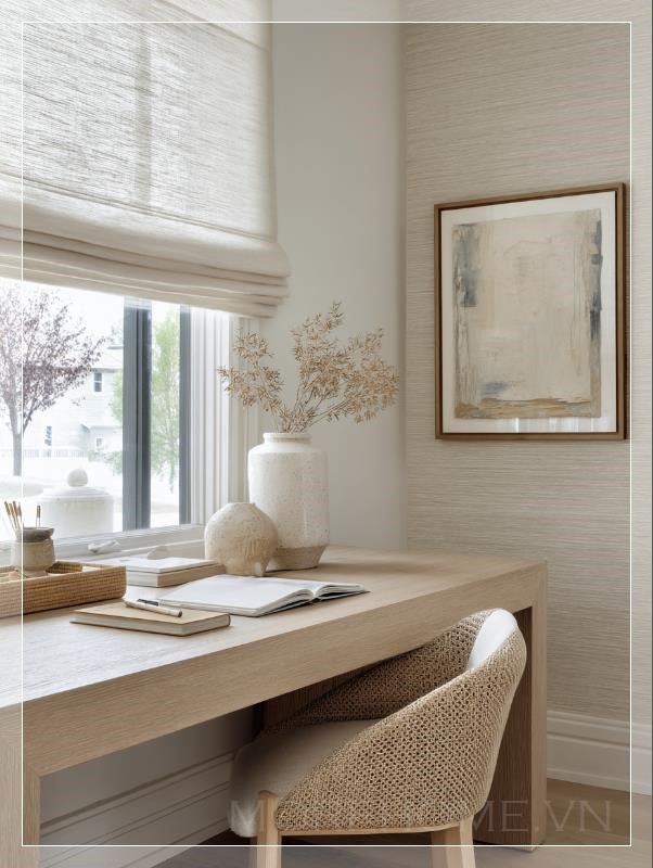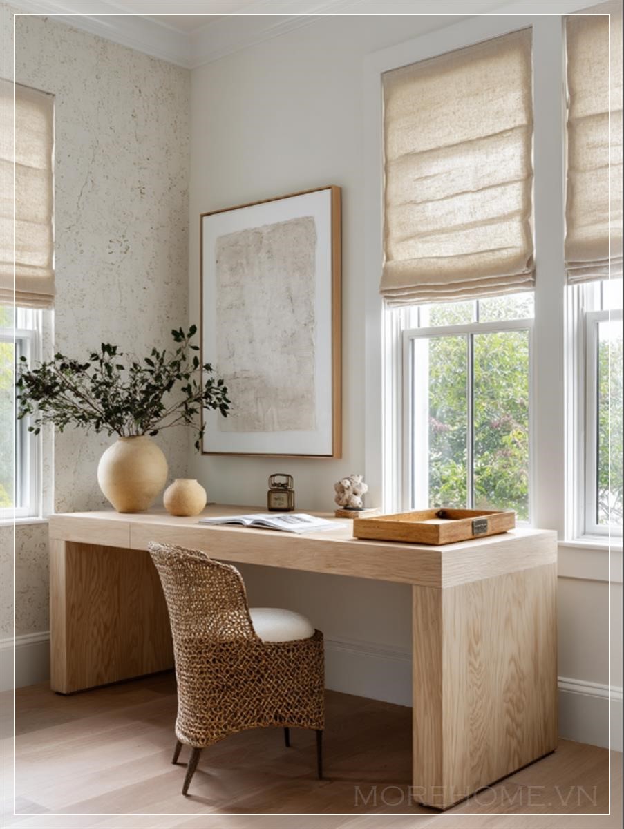 Chúng ta có thể tưởng tượng một không gian làm việc với bàn làm việc bằng gỗ sồi trắng, nổi bật với sự nổi trôi của thiết kế. Với những chi tiết nhỏ như tấm rèm vải lanh trắng nhẹ nhàng, không gian này mang lại cảm giác thanh thoát và thoải mái. Các vật dụng trong không gian này, từ khay tài liệu mây đến những chiếc bình gốm mộc mạc, đều mang lại sự hòa hợp tự nhiên, tạo nên một không gian vừa sáng tạo, vừa nghệ thuật. Những bức tranh với các cạnh tự nhiên, thô sơ, trở thành điểm nhấn thú vị, làm bật lên sự thanh thoát trong phong cách thiết kế này.