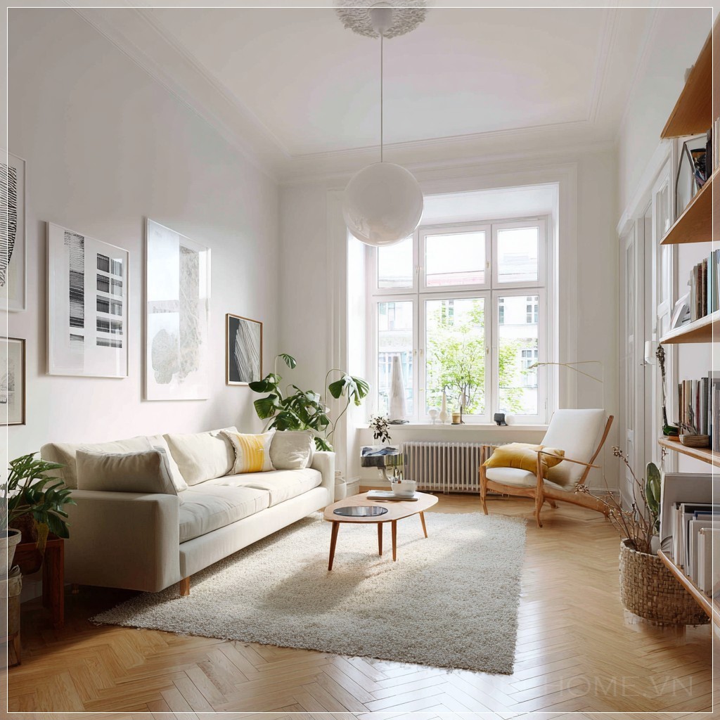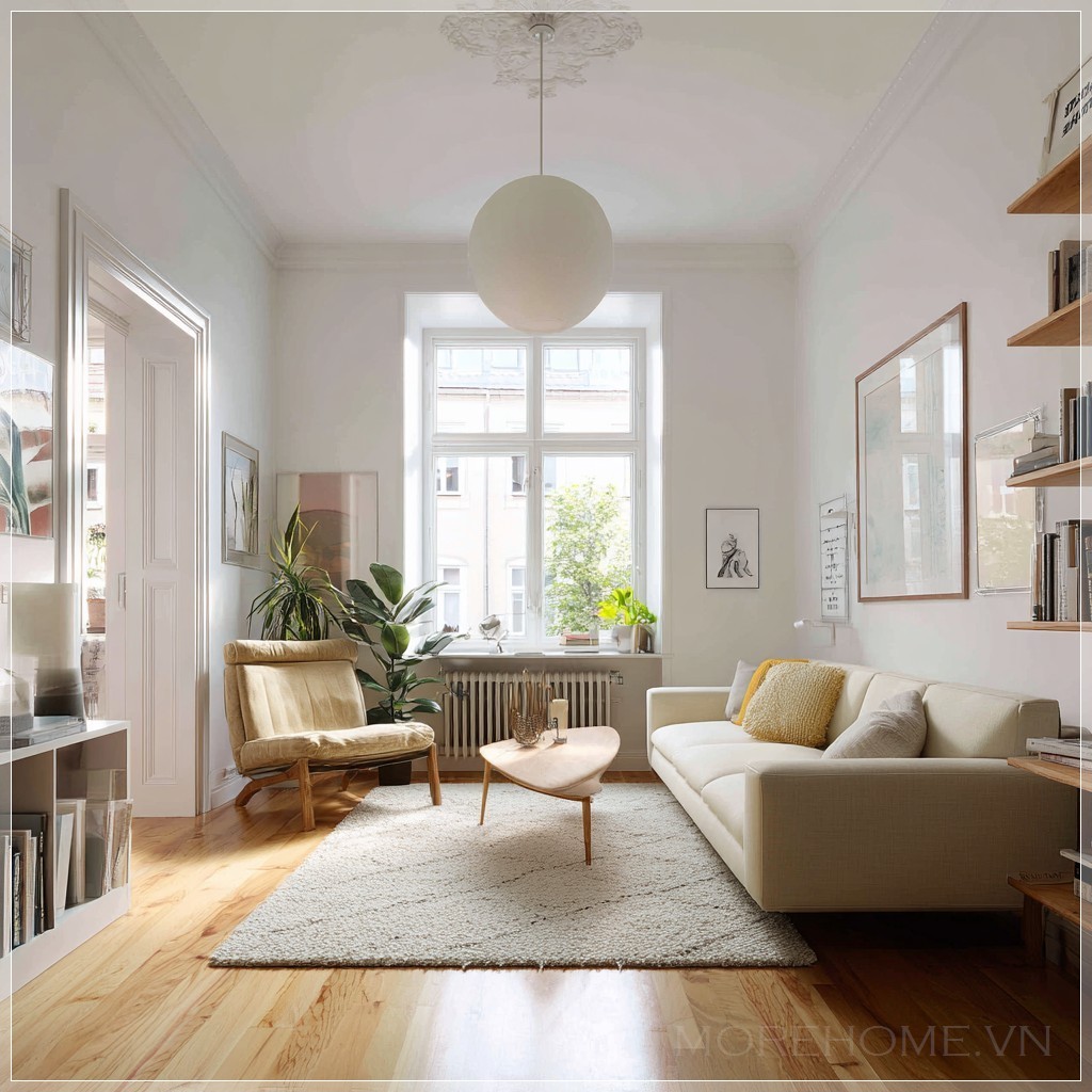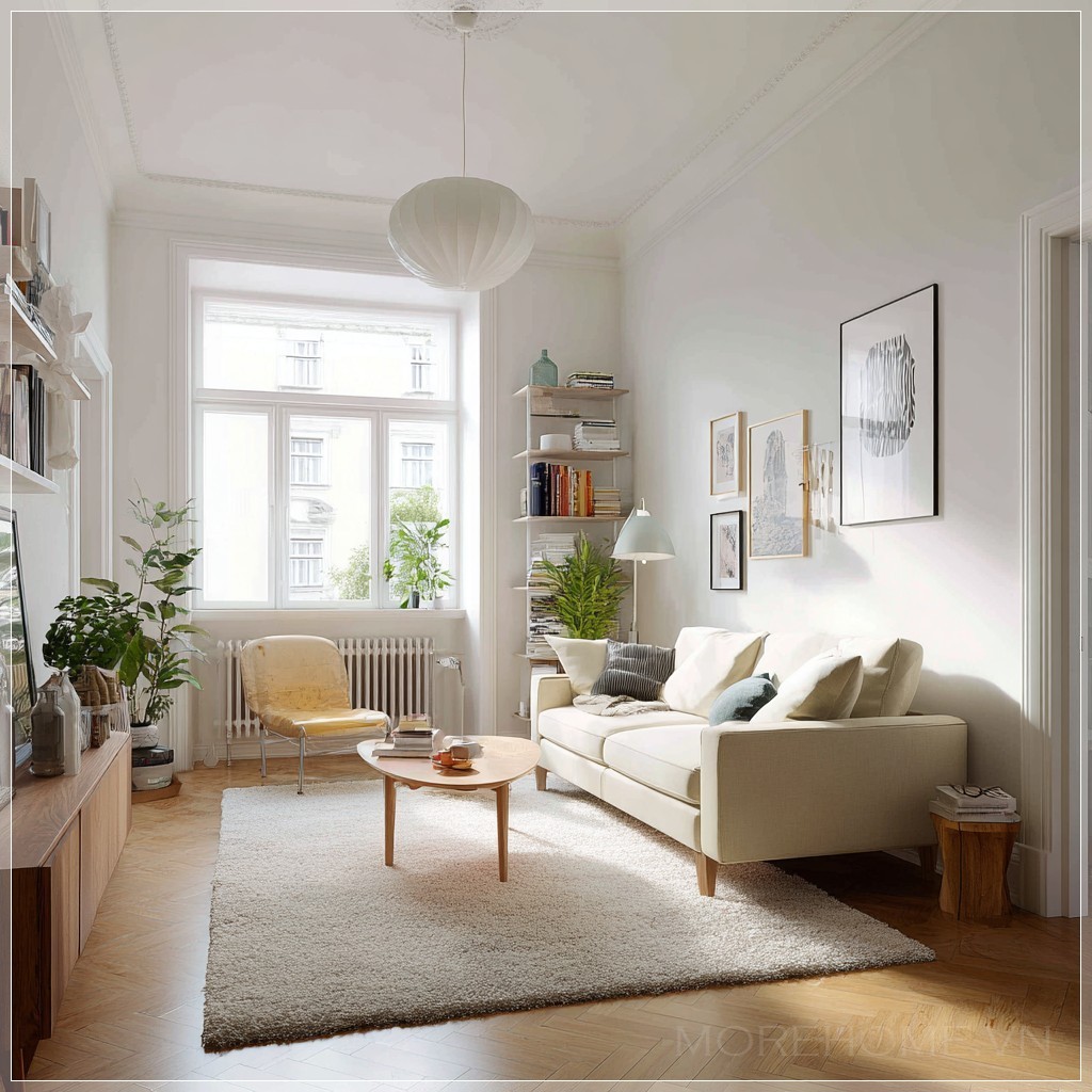 Thiết kế Bắc Âu đặt trọng tâm vào sự tối giản, nhưng không có nghĩa là lạnh lẽo hay đơn điệu. Với gam trắng làm nền, ánh sáng tự nhiên được lan tỏa khắp không gian, tạo cảm giác mở rộng và thông thoáng. Màu xám – thường xuất hiện ở sofa, thảm trải sàn hoặc gối tựa – đóng vai trò cân bằng thị giác, giúp không gian không bị quá sáng hoặc khô cứng. Sự hiện diện của gỗ tự nhiên, đặc biệt là các chi tiết như bàn trà, chân ghế hoặc hệ lam ốp nhẹ, là yếu tố quan trọng để mang lại chiều sâu và nét sinh động cho tổng thể phòng khách.