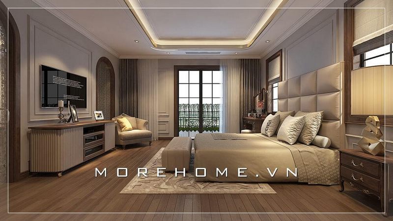 Một chiếc giường lớn với đệm cao cấp là điểm nhấn quan trọng, không chỉ mang lại cảm giác thoải mái khi nghỉ ngơi mà còn tạo ra sự sang trọng cho toàn bộ căn phòng. Kết hợp với đó, các món đồ nội thất như tủ quần áo âm tường hay bàn trang điểm thông minh sẽ giúp tiết kiệm diện tích và giữ cho không gian luôn gọn gàng, ngăn nắp.